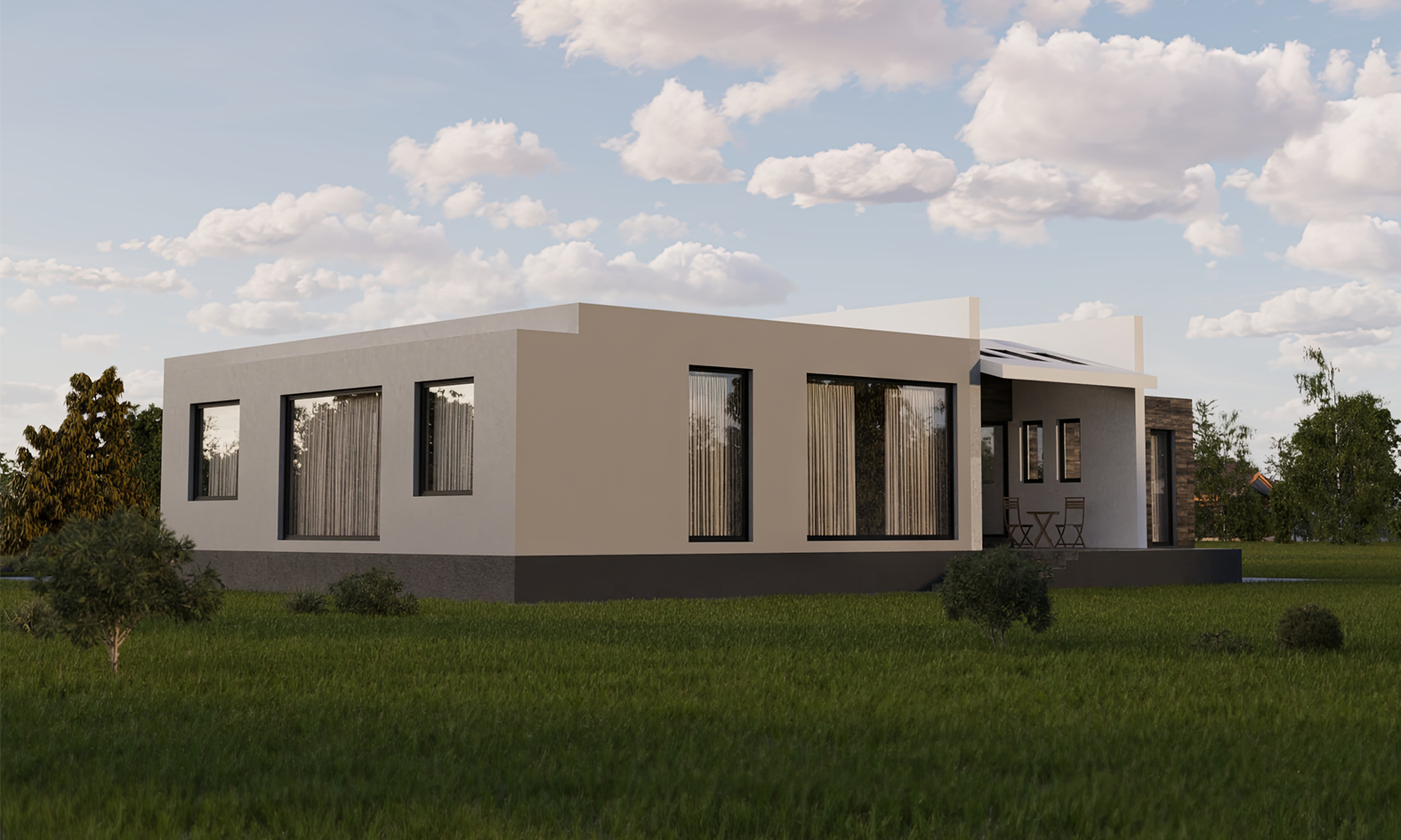 Планировка разделяет общественные и приватные зоны. Просторная кухня-гостиная с выходом на террасу становится центром дома и естественным местом для отдыха и общения.
